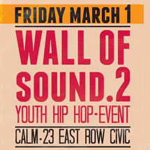 CALM ACT is holding its second installment of the Wall Of Sound Youth Hip Hop Event on Friday March the 1st from 5pm - 8pm at 23 East Row St Civic, Youth aged between 12 & 25 year's of age are welcome to come.