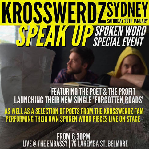 Krosswerdz (Sydney) is teaming up with SpeakUP (Speak Urban Poetry - Central Coast) this month to kick the year off in poetic fashion.